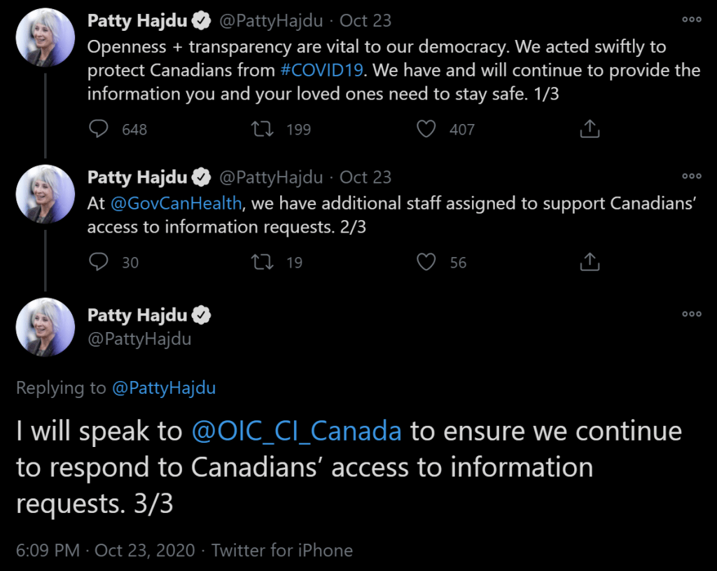 On Friday, Minister Hajdu announced she had additional staff assigned to support Canadians’ access to information requests, and would be speaking to the Information Commissioner to address the issue: