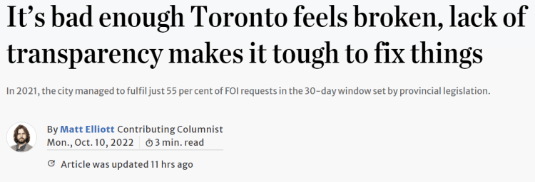 In his Toronto Star article, Matt Elliott notes that as of the 2021 reporting year, the City of Toronto was only able to respond to FOI requests within the basic 30-day deadline 55 percent of the time. Even taking “extended compliance” into account, where the City of Toronto issues an extension to the 30-day deadline in compliance with the Municipal Freedom of Information and Protection of Privacy Act, “the city still only managed to hit their extended due date for FOI requests 62 per cent of the time across 2,860 completed requests last year”. I recommend reading the full article for insights into how the City of Toronto compares to other Ontario municipalities and concerns over how the City of Toronto’s FOI performance has been trending over the long term.